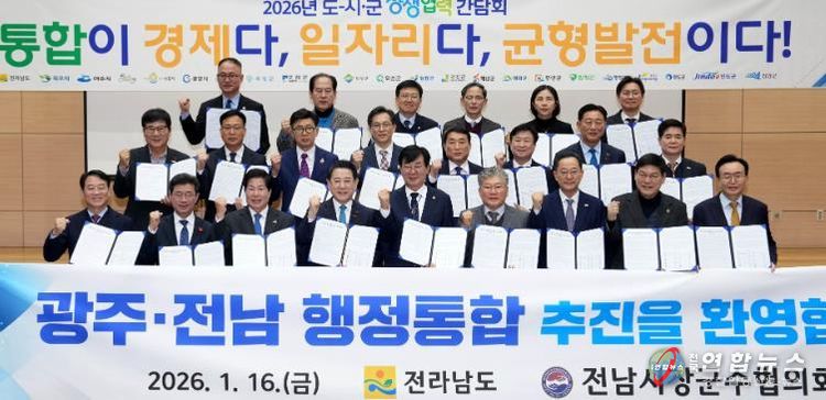 전국연합뉴스 김철환 기자 | 전라남도는 16일 전남도청 왕인실에서 ‘2026년 도-시군 상생협력 간담회’를 열어 지역 대도약을 위한 광주·전남 행정통합 추진에 도와 22개 시군이 공동 보조를 맞추기로 했다.