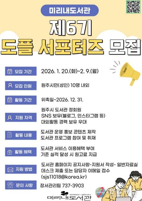 전국연합뉴스 유근택 기자 | 원주시 미리내도서관은 오는 20일부터 올 한 해 도서관과 함께 할 ‘제6기 도플 서포터즈’를 모집한다.