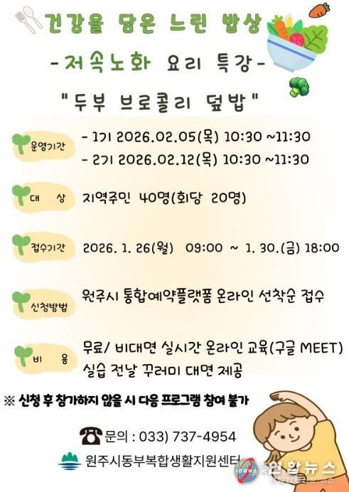전국연합뉴스 유근택 기자 | 원주시 동부복합생활지원센터는 오는 26일부터 저속노화 요리 특강 ‘건강을 담은 느린 밥상’ 프로그램 참여자를 모집한다.