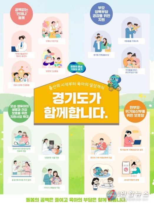 전국연합뉴스 조민준 기자 | 경기도가 공백 없는 돌봄을 제공하고, 한부모와 위기임산부를 위한 보호망을 펼치는 등 도내 부모들이 마음 편히 아이를 낳고, 키울 수 있도록 정책들을 올해도 추진한다. 공백 없는 돌봄부터 난임부부, 산후조리원, 위기임산부 지원 등 경기도의 주요 출산·육아 정책까지 다양하고 실질적 대책이다.