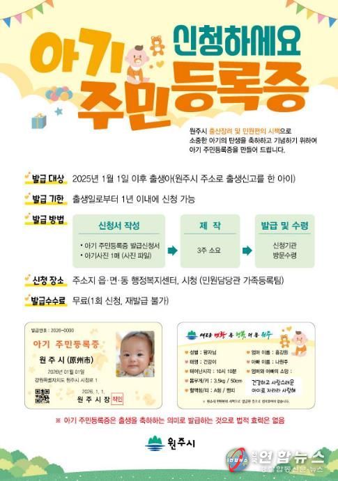 전국연합뉴스 유근택 기자 | 원주시는 출산 장려 및 민원 편의를 위해 ‘아기주민등록증’ 무료 발급 사업을 올해도 지속해서 추진한다.