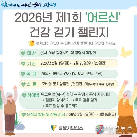 전국연합뉴스 조민준 기자 | 광명시가 오는 2월부터 모바일 걷기 플랫폼 ‘워크온(WalkOn)’을 활용한 걷기 챌린지 방식을 개편하고, 65세 이상 시민을 위한 ‘어르신 걷기 챌린지’를 별도로 운영한다고 21일 밝혔다.