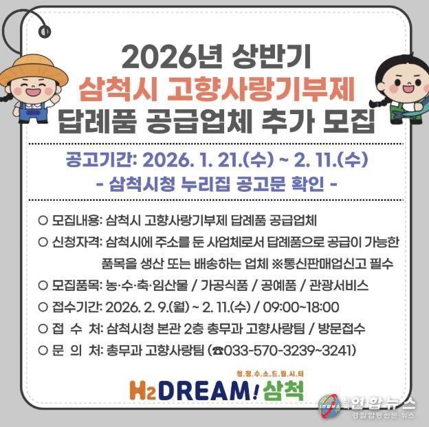 전국연합뉴스 권찬규 기자 | 삼척시는 고향사랑기부제의 안정적인 운영과 지역경제 활성화를 위해 답례품 공급업체 추가 모집을 실시한다고 밝혔다.