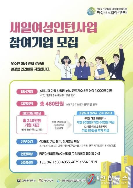 전국연합뉴스 김용태 기자 | 당진시는 당진여성새로일하기센터에서 ‘새일여성인턴사업’에 참여할 기업과 참여자를 연중 상시 모집한다고 27일 밝혔다.