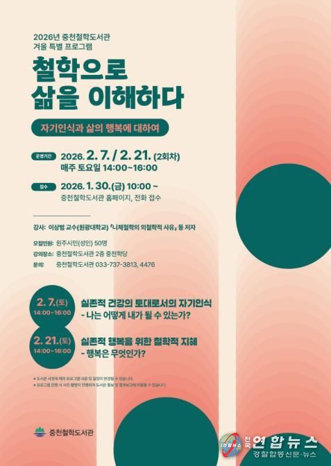 전국연합뉴스 유근택 기자 | 원주시 중천철학도서관은 오는 2월, 시민을 대상으로 겨울 특별 철학 프로그램 ‘철학으로 삶을 이해하다–자기인식과 삶의 행복에 대하여’를 운영한다.