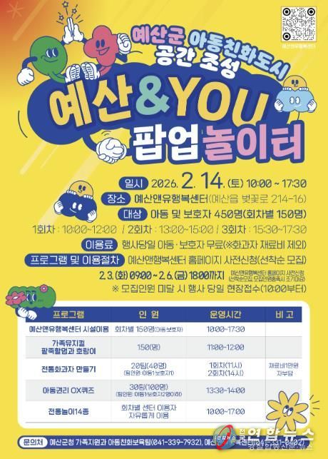 전국연합뉴스 김용태 기자 | 예산군은 아동친화도시 공간 조성의 하나로 아동과 가족이 함께 즐길 수 있는 ‘예산앤유(&YOU) 팝업(한시운영) 놀이터’를 2월 14일 예산앤유행복센터에서 운영한다고 밝혔다.