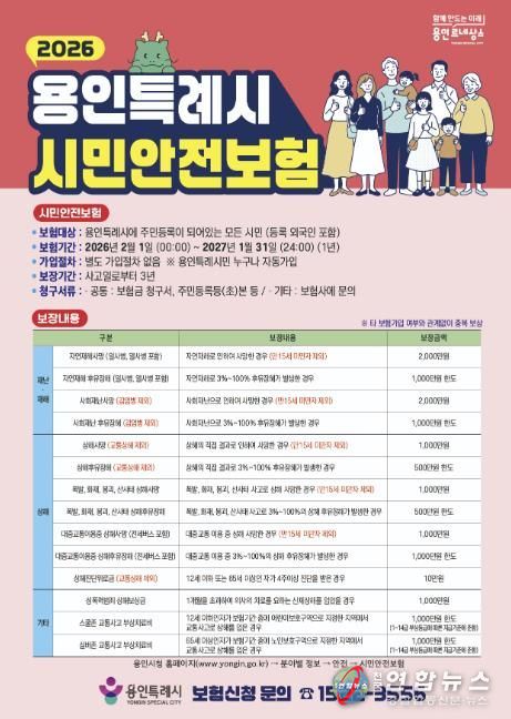 전국연합뉴스 박남호 기자 | 용인특례시는 각종 재난과 사고로 피해를 본 시민의 생활 안정을 지원하기 위해 시민안전보험에 가입했다고 2일 밝혔다.