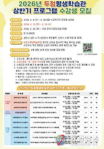 전국연합뉴스 김대환 기자 | 천안시 두정평생학습관은 오는 12일부터 ‘2026년 상반기 평생학습 프로그램’ 수강생 535명을 선착순 모집한다고 2일 밝혔다.