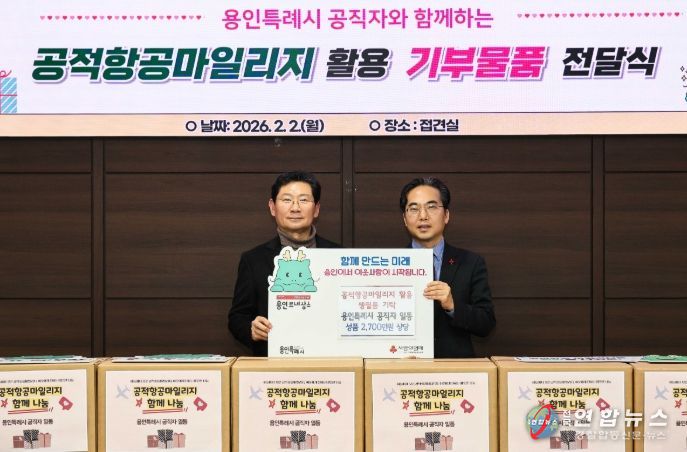 전국연합뉴스 박남호 기자 | 용인특례시는 2일 시청 접견실에서 ‘공적 항공마일리지 함께 나눔’ 기탁식을 열어 공직자들이 국외출장 과정에서 적립한 공적 항공마일리지를 활용한 기부 물품을 경기사회복지공동동모금회에 전달했다고 밝혔다.