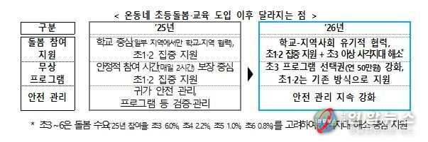 교육부는 2024년부터 늘봄학교 정책을 통해 초등학교 1‧2학년의 돌봄 공백 해소를 집중적으로 지원해 왔다. 2026년부터는 기존의 늘봄학교를 ‘온동네 초등돌봄‧교육’ 정책으로 발전시켜, ①학교와 지역사회가 함께 희망하는 초등학생에게 사각지대 없는 돌봄을 제공하고, ②돌봄보다 교육에 대한 수요가 큰 초등학교 3학년 이상 학생*의 방과후 교육 참여를 중점 지원한다.