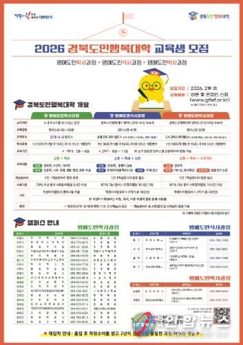 전국연합뉴스 김삿갓 기자 | 영주시는 시민들에게 체계적이고 수준 높은 평생학습 기회를 제공하기 위해 2월 2일부터 2월 13일까지 ‘2026년 경북도민행복대학 영주시캠퍼스’ 신입생 50명을 모집한다.