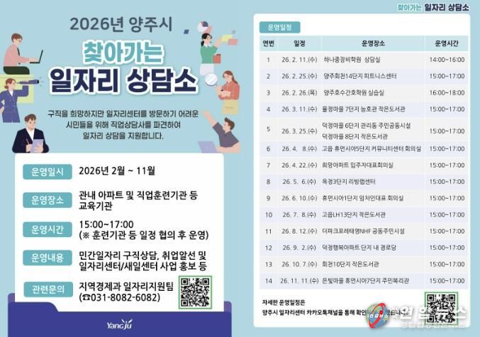 전국연합뉴스 박점규 기자 | 양주시가 구직 현장의 문턱을 낮추고 시민들의 취업 성공률을 높이기 위해 오는 11월까지 ‘2026년 찾아가는 일자리 상담소' 를 운영한다.
