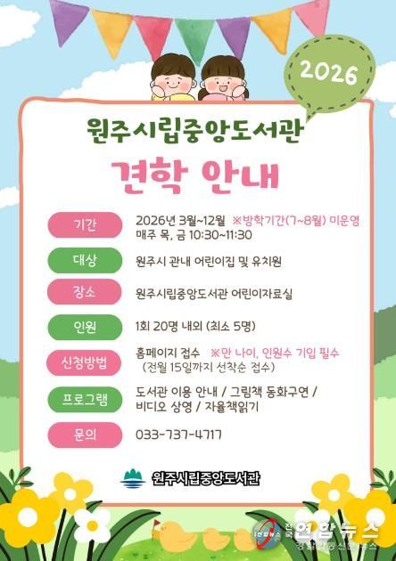 전국연합뉴스 유근택 기자 | 원주시립중앙도서관은 오는 3월부터 12월까지 관내 유치원과 어린이집을 대상으로 도서관 견학 프로그램을 운영한다.