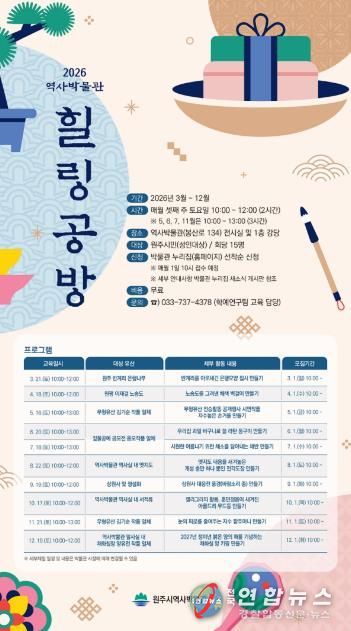 전국연합뉴스 유근택 기자 | 원주시역사박물관은 오는 3월부터 성인을 대상으로 한 유물 연계 교육프로그램 ‘2026년 역사박물관 힐링 공방’을 운영한다.