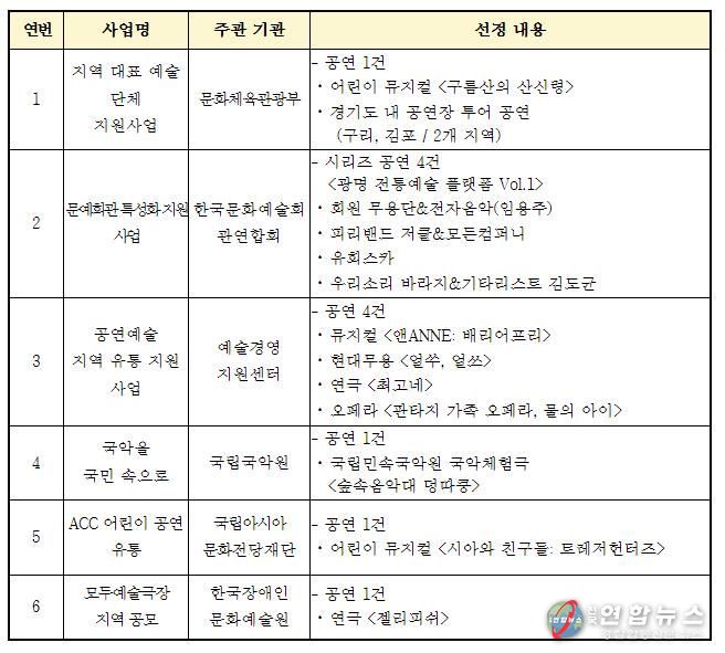 이번에 선정된 사업은 ▲지역 대표예술단체 지원 사업(문화체육관광부) ▲문예회관 특성화 지원 사업(한국문화예술회관연합회) ▲공연예술 지역 유통 지원 사업(예술경영지원센터) ▲지역 문화향유기회 확대를 위한 '국악을 국민 속으로'(국립국악원) ▲ACC 어린이 공연 유통(국립아시아문화전당재단) ▲모두예술극장 지역 공연 공모(한국장애인문화예술원)이다.