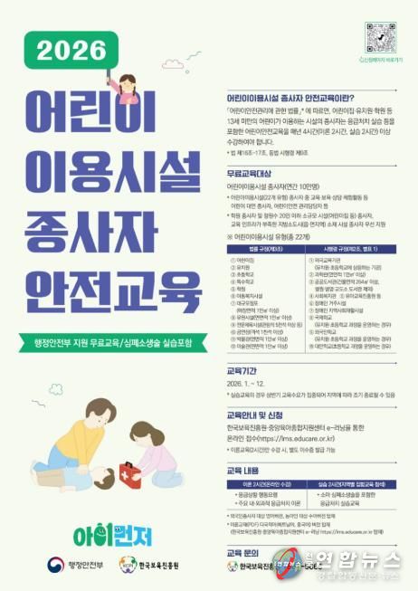 전국연합뉴스 유근택 기자 | 원주시는 행정안전부가 주관하는 ‘2026년 어린이 이용시설 종사자 안전교육’을 실시한다.