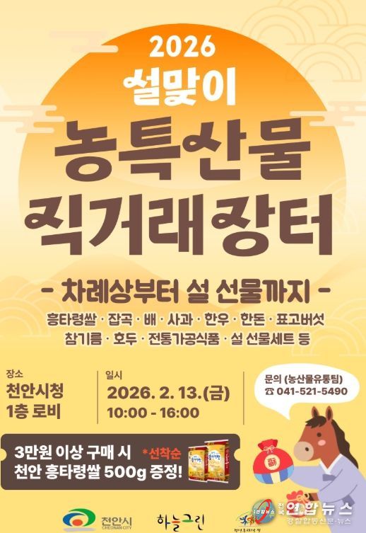 윤석훈 농업환경국장은 “이번 직거래장터는 참여 단체와 품목을 확대하고, 사은행사까지 더해 시민들이 체감할 수 있는 혜택을 강화했다”며 “신선하고 안전한 천안 농특산물을 합리적인 가격에 구매하고, 지역 농가에도 힘이 되는 설 명절이 되길 바란다”고 말했다.