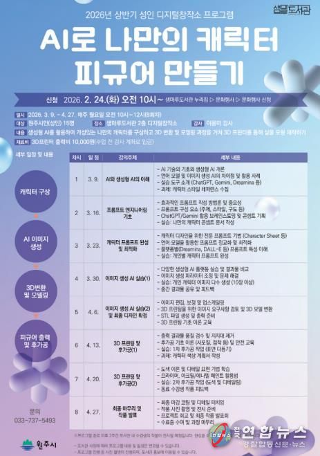 전국연합뉴스 유근택 기자 | 원주시 샘마루도서관은 서부권 시민들의 디지털 창작 역량 증진을 위해 오는 3월부터 ‘상반기 성인 디지털창작소 프로그램’을 운영한다.