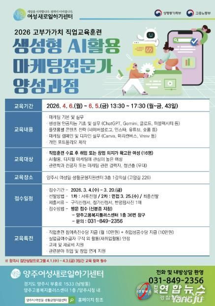 전국연합뉴스 박점규 기자 | 양주여성새로일하기센터에서는 오는 3월 4일부터 20일까지 직업교육훈련 과정인 ‘생성형 인공지능(AI)활용 마케팅전문가 양성과정' 교육생을 모집한다.
