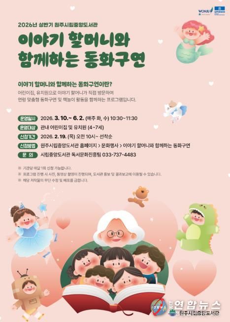 전국연합뉴스 유근택 기자 | 원주시립중앙도서관은 오는 3월부터 관내 어린이집과 유치원을 대상으로 ‘이야기 할머니와 함께하는 동화구연’ 프로그램을 운영한다.