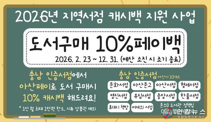 전국연합뉴스 김용태 기자 | 아산시는 지역 서점 활성화와 시민 독서환경 조성을 위해 오는 23일부터 “2026년 충남 인증 서점 도서 구매 캐시백 지원” 사업을 본격 시행한다.