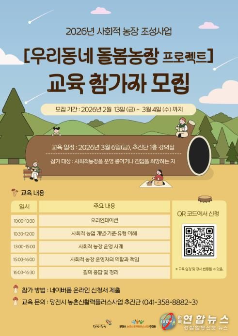 전국연합뉴스 김용태 기자 | 당진시는 농촌신활력플러스사업 추진단에서 2026년 사회적 농장 조성사업의 일환으로 추진하는 ‘우리동네 돌봄농장 프로젝트’ 교육 참가자를 모집한다고 23일 밝혔다.