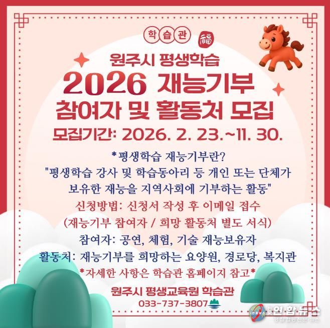 전국연합뉴스 유근택 기자 | 원주시 평생교육원 학습관은 오는 11월 말까지 2026년 원주시 평생학습 재능기부 참여자 및 활동처를 수시 모집한다.