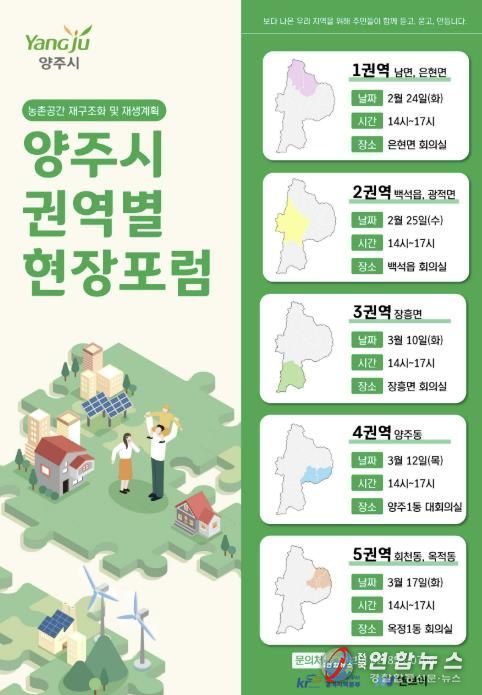 전국연합뉴스 박점규 기자 | 양주시가 오는 24일부터 3월 17일까지 5차례에 걸쳐 ‘농촌공간 재구조화 및 재생 기본계획’ 수립을 위한 권역별 주민현장포럼을 개최할 예정이다.