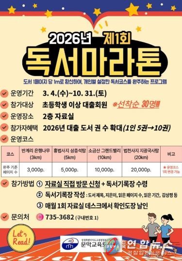 전국연합뉴스 유근택 기자 | 문막교육도서관은 관내 이용자의 지속적인 독서 습관 형성 및 함께 읽는 독서문화조성을 위해 2026년 제1회 ‘독서마라톤’을 운영한다.