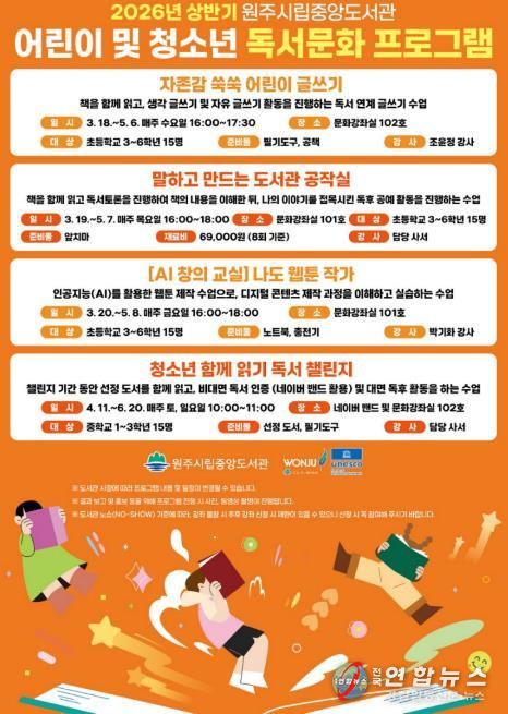 전국연합뉴스 유근택 기자 | 원주시립중앙도서관은 오는 3월부터 6월까지 ‘2026년 상반기 어린이 및 청소년 독서문화 프로그램’을 운영한다.