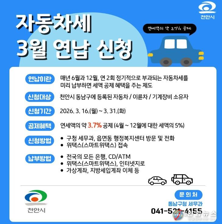전국연합뉴스 김대환 기자 | 천안시 동남구는 내달 16~ 31일 자동차세 연납 신청을 받는다고 27일 밝혔다.