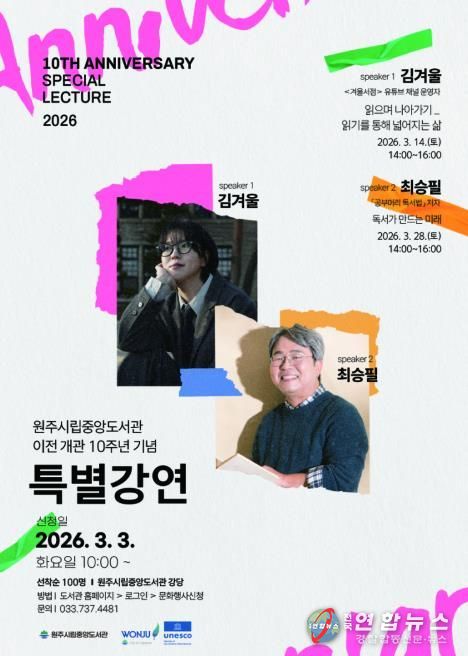 전국연합뉴스 유근택 기자 | 원주시립중앙도서관은 단구동 이전 개관 10주년을 맞아 시민과 함께하는 특별강연을 개최한다. 이번 강연은 독서의 가치와 삶의 확장 가능성을 주제로, 각 분야에서 활발히 활동 중인 전문가를 초청해 시민들에게 깊이 있는 인문 경험을 제공한다.