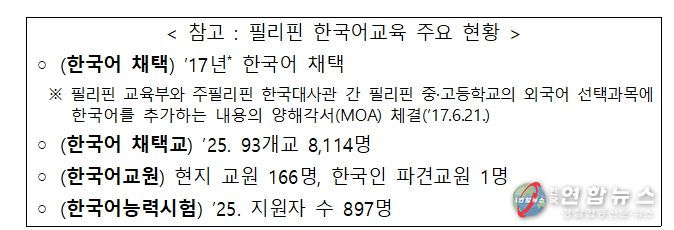필리핀은 2017년에 현지 정규 교육과정의 외국어 과목으로 한국어를 정식 채택하는 것으로 결정하고, 2018년부터 한국어반을 운영해 왔다. 현재는 90여 개 학교에서 8,000여 명의 학생들이 한국어를 배우고 있다. 이번 양해각서는 한국 교육부가 필리핀 내 한국어 교사들을 위한 집중 연수 과정을 지원하여, 한국어교육 전문성을 높이도록 하는 내용이 핵심이다.