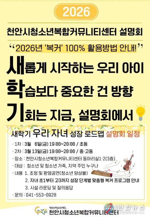 전국연합뉴스 김대환 기자 | 천안시청소년재단 산하 천안시청소년복합커뮤니티센터는 오는 6일과 13일 두 차례에 걸쳐 ‘새 학기 우리 자녀 성장 로드맵’ 설명회를 개최한다.