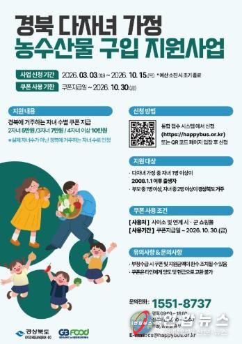 영주시는 다자녀 가정의 양육 부담 완화와 지역 농수산물 소비 활성화를 위해 ‘2026년 다자녀 가정 농수산물 구입 지원사업’을 3월 3일부터 예산 소진 시까지 신청·접수한다고 밝혔다.