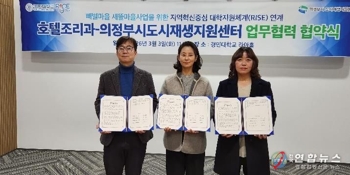 전국연합뉴스 박점규 기자 | 의정부시도시재생지원센터는 3월 3일 경민대학교 호텔조리과와 성공적인 빼벌새뜰마을사업을 위해 업무협약을 체결했다.