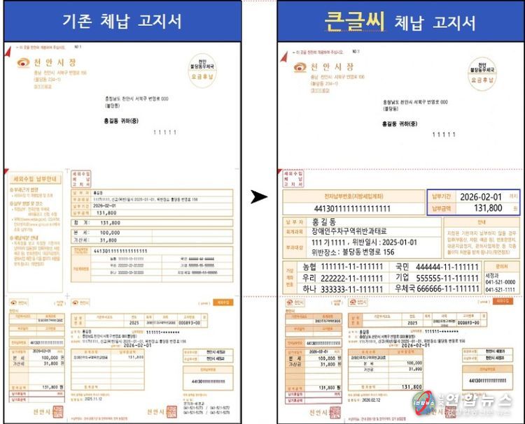 전국연합뉴스 김대환 기자 | 천안시는 납부자가 고지 내용을 한눈에 쉽고 정확하게 파악할 수 있도록 세외수입 체납고지서에 글자 크기를 대폭 확대한 ‘돋보기 고지서’를 도입한다고 6일 밝혔다.