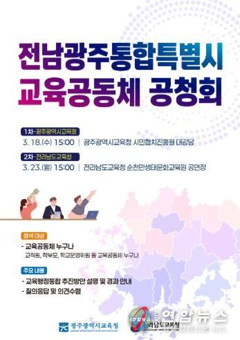 전국연합뉴스 기자 | 광주시교육청 ‘광주전남교육행정통합실무단’과 전남도교육청 ‘전남광주교육행정통합추진단’이 교육통합과 관련해 시도민의 이해를 돕기 위해 ‘전남광주통합특별시 교육공동체 공청회’를 개최한다.
