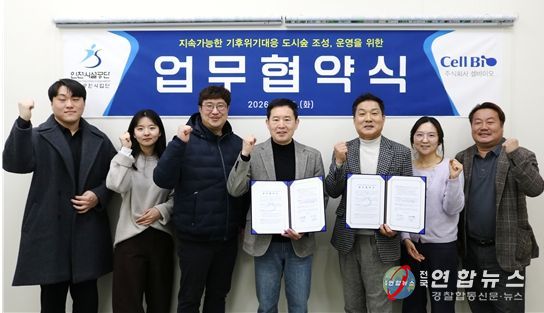 전국연합뉴스 박우배 기자 | 인천시설공단 청라공원사업단이 지난 10일, 한국서부발전 사내벤처 ㈜셀바이오(대표이사 변형완)와 함께 업무협약을 체결하고 민관 협력을 통한 도시숲 조성과 공원 관리 효율화에 나선다.
