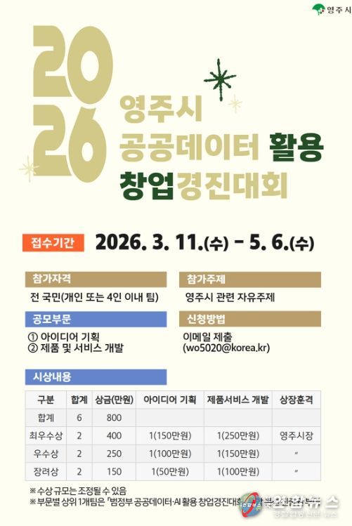 전국연합뉴스 김삿갓 기자 | 영주시는 공공데이터 기반 창업을 촉진하기 위해 3월 11일부터 5월 6일까지 ‘2026년 영주시 공공데이터 활용 창업경진대회’ 참가자를 모집한다.