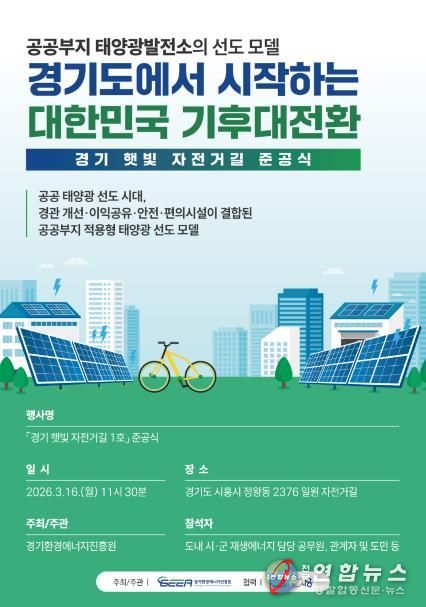 전국연합뉴스 조민준 기자 | 경기환경에너지진흥원은 16일 시흥시 정왕동 2376일원 자전거길에서 ‘경기 햇빛 자전거길 1호’ 준공식을 개최한다고 13일 밝혔다.