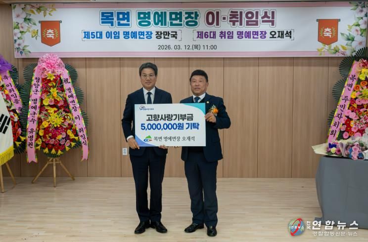 전국연합뉴스 김용태 기자 | 청양군은 지난 12일 목면 명예면장으로 취임한 오재석 (주)최고무역 대표가 고향사랑기부금 500만 원을 기탁하며 남다른 고향 사랑을 실천했다고 밝혔다.