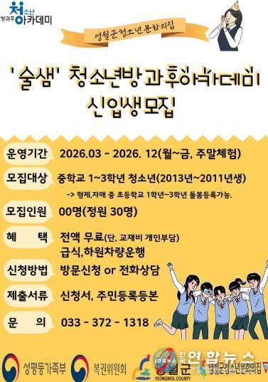 전국연합뉴스 기자 | 영월군 주천면에 위치한 영월군청소년문화의집이 ‘술샘’ 청소년방과후아카데미에 참여할 청소년을 모집한다.