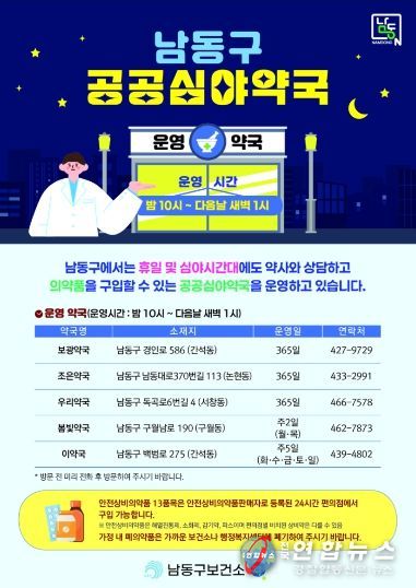 전국연합뉴스 오민교 기자 | 인천시 남동구가 심야시간대 의약품 구입 불편을 해소하고, 안전하고 편리한 공공보건의료 서비스를 제공하기 위해 ‘공공심야약국’을 운영한다고 16일 밝혔다.