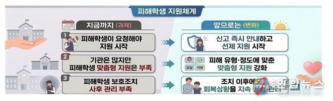 피해학생 관점에서 지원 체감도를 높이기 위해 사안처리 전 과정에서 피해학생 지원 체계를 재정비한다. 이전에는 피해학생과 학부모가 지원받을 수 있는 서비스를 찾아다녔다면, 앞으로는 학교폭력 신고·접수 시 학교장이 피해학생에게 지원 가능한 서비스, 보호조치와 절차를 신속하게 안내하도록 제도를 개선할 예정이다.