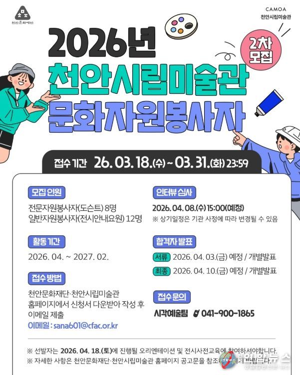 전국연합뉴스 김대환 기자 | 천안문화재단은 오는 31일까지 천안시립미술관 문화자원봉사자 2차 모집을 추진한다고 18일 밝혔다.