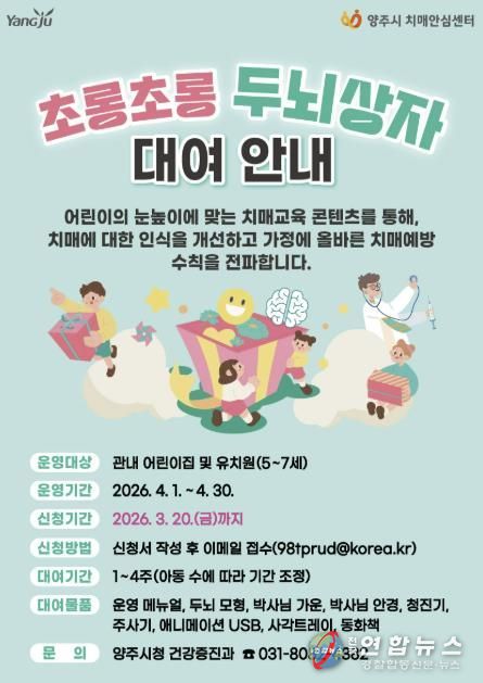 전국연합뉴스 박점규 기자 | 양주시서부치매안심센터는 어린이 대상 치매 인식개선사업인 ‘초롱초롱 두뇌상자’ 대여사업을 운영한다. 이번 사업은 어린이들의 눈높이에 맞춘 치매 교육을 통해 치매에 대한 올바른 이해를 돕고, 가족 내 치매 예방 실천 문화를 확산하기 위해 마련됐다.