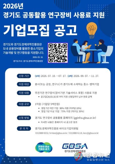 전국연합뉴스 조민준 기자 | 경기도와 경기도경제과학진흥원이 도내 중소·벤처기업의 연구개발(R&D) 경쟁력 강화를 위해 ‘2026년 경기도 공동활용 연구장비 사용료 지원 사업’을 추진한다.