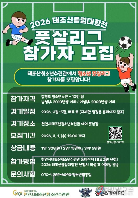 전국연합뉴스 김대환 기자 | 천안시청소년재단 산하 천안시태조산청소년수련관은 청소년의 건강한 여가 활동과 스포츠 참여 기회를 확대하기 위해 ‘2026 태조산 클럽대항전 풋살리그’ 참가팀을 모집한다고 20일 밝혔다.