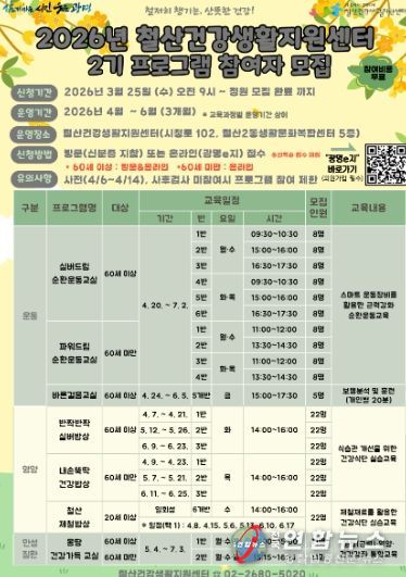 전국연합뉴스 조민준 기자 | 광명시 보건소 철산건강생활지원센터가 ‘2026년 건강생활 프로그램 2기’ 참가자를 오는 25일 오전 9시부터 선착순 모집한다.